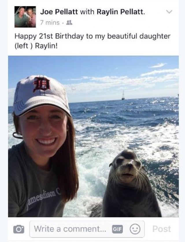 Joe Pelatt quiso felicitar a su hija a través de Twitter y para hacerlo escogió una foto de su último viaje a Méjico. En la foto se puede ver a Raylin al lado de una foca que saltó en la barca donde iban. Hasta aquí, todo parece normal. Una foto familiar de un viaje divertido. Pero...la foto se ha viralizado precisamente por el texto que Joe añadió a la imagen.