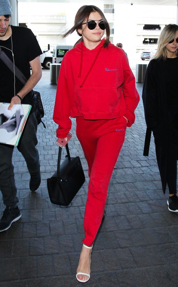 París vistiendo un chándal rojo muy cómodo que usó para descansar durante el viaje. Eso sí, se puso unos tacones de sandalia blancos que tanto estan ahora de moda.